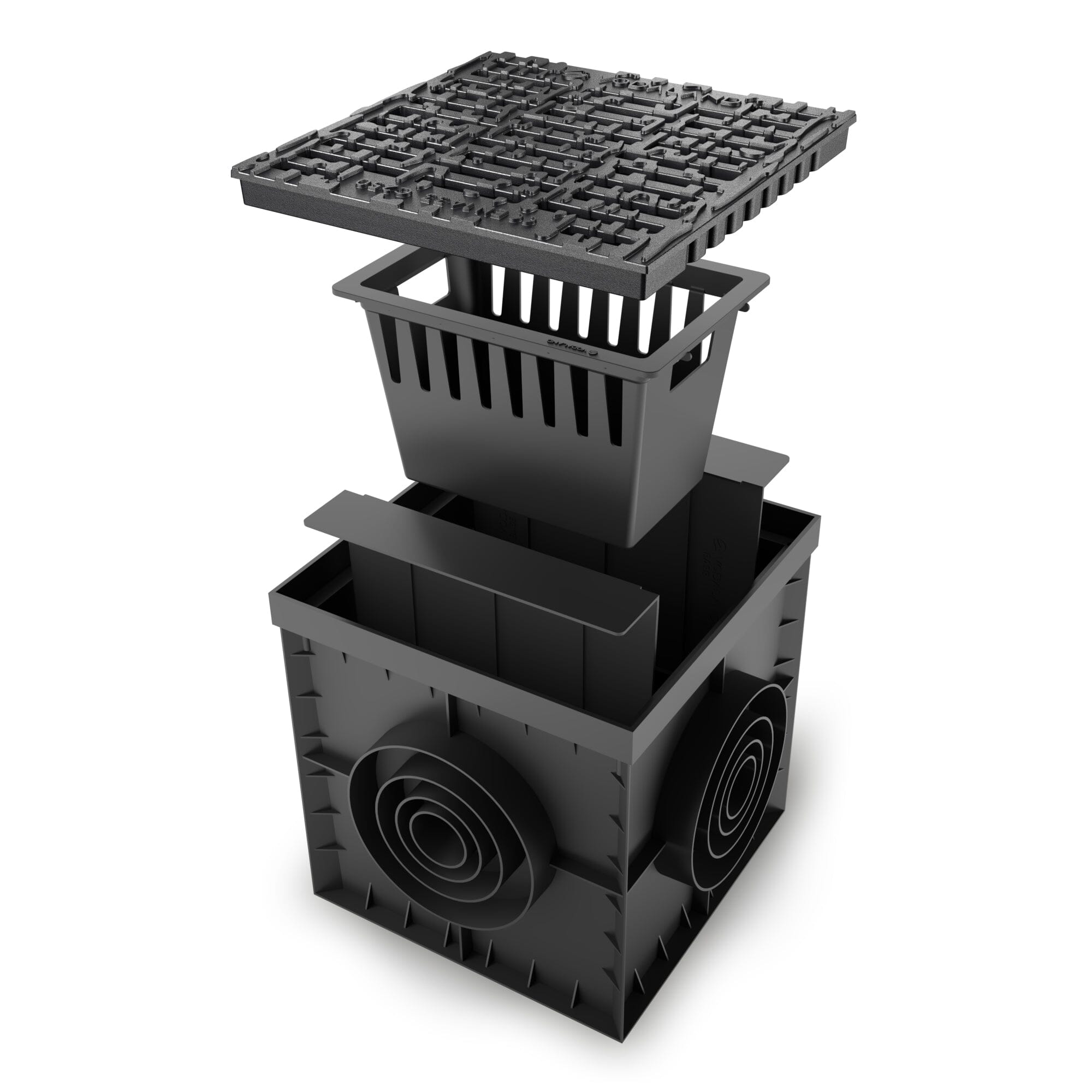 Vodaland's 12x12 BASE plastic catch basin is a square basin with a 12" width, length, and height. This catch basin comes with a C-class ductile cast iron grate. The C load class is for all residential vehicles and even light commercial traffic. This basin can be connected to our 4” Base plastic trench drain when used with a riser and has pipe connection outlets in diameters of 2”, 3”, 4”, and 6” on all four sides. Each basin features an internal debris basket and partition panels so that all debris and sediment are separated from the liquid being discharged. Common applications include driveways, garages, public facilities, light commercial facilities, underground parkings.